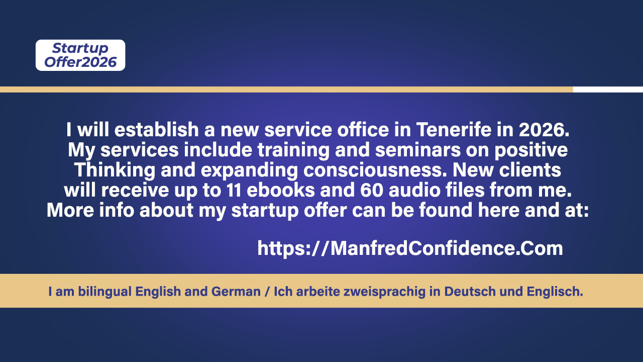 German/English Author, Speaker and Editor. Founder and Creator of ManfredConfidence.Com, PositiveCentrum.Com, PositiveSelfhelp.Info, PositiveWorldchange.Info, PositiveSpirituality,Info, PositiveArchive.Com and PositiveBoomers.International and TenerifeOffice.Info. Teaching, Training and Consulting Meetings in Europe, Online and in Tenerife, Canary Islands.